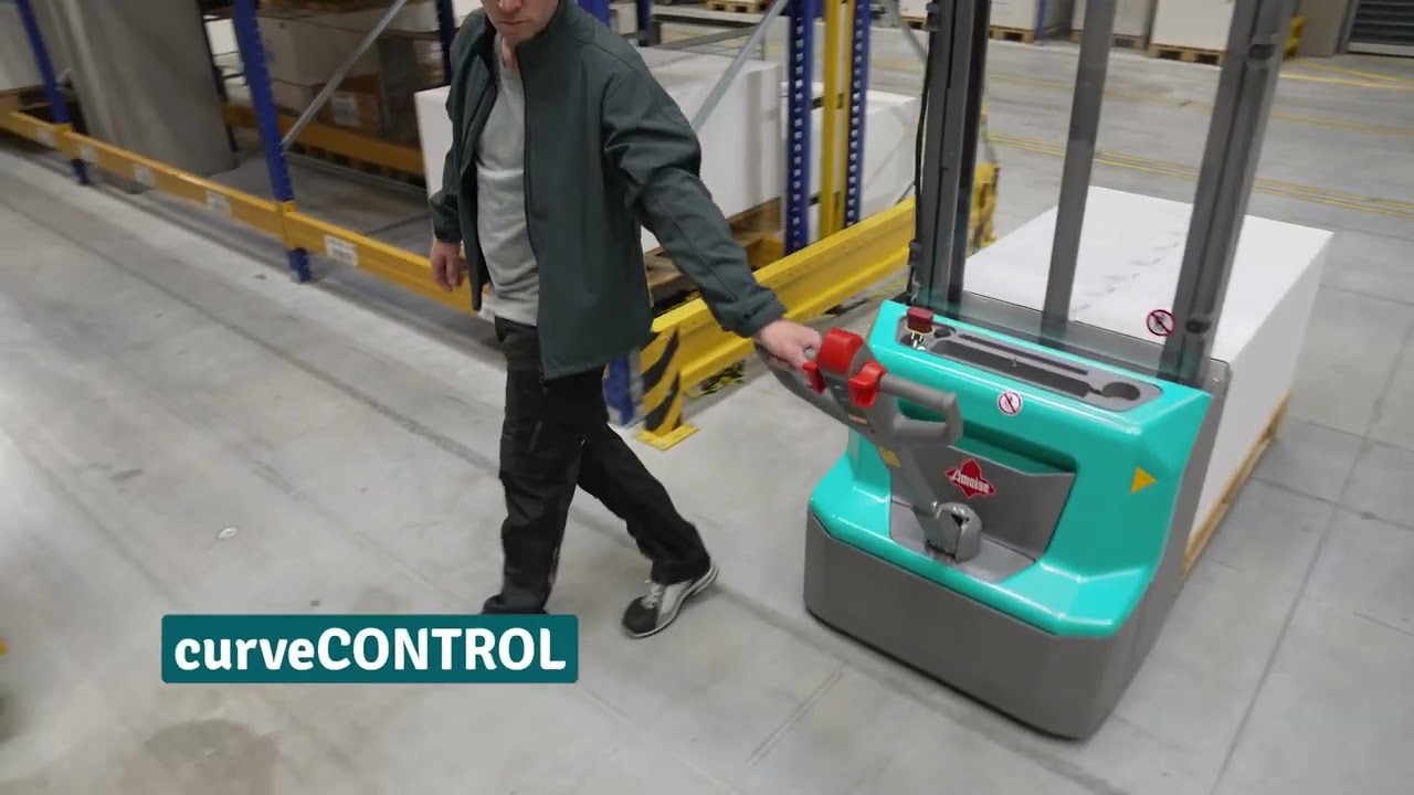 El apilador eléctrico Ameise® PSE 1.2 - Iones de litio se conduce con comodidad y seguridad mediante su larga barra timón situada en el centro. Todas las funciones de marcha y elevación se controlan con el mango de la barra timón, multifunción y ergonómico, utilizable desde ambos lados. El acceso con código pin impide el uso por una persona no autorizada. Ya no se tendrá que preocupar nunca más si la llave no está en su sitio o se ha perdido. La pantalla indicadora informa en todo momento sobre el nivel de carga de la batería. El interruptor de desconexión de emergencia, el cargador de batería integrado y la función de arranque están en el centro del aparato, igual que una bandeja portaobjetos.