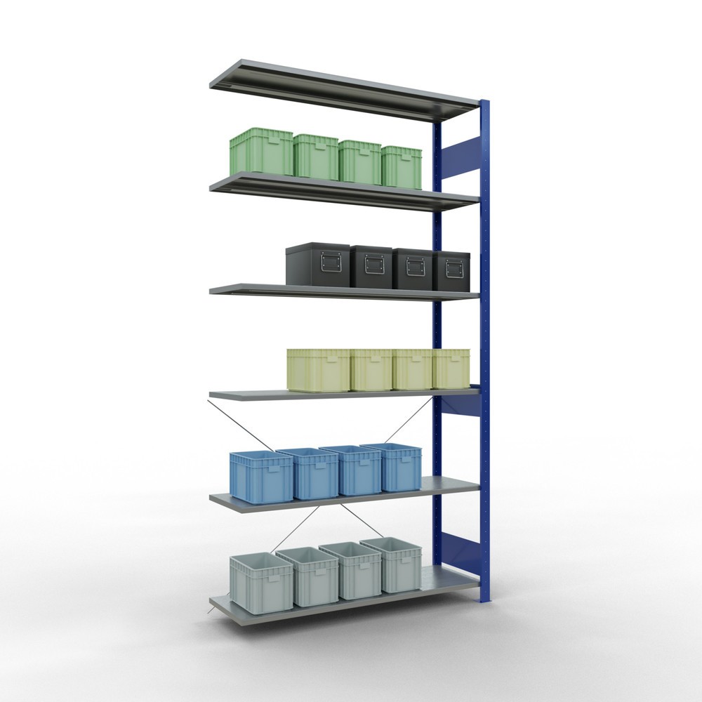 Construya un sistema de estanterías modular totalmente según sus necesidades y haga aquí su pedido de estantería de cargas pequeñas SCHULTE, módulo adicional con bastidor de color azul genciana y baldas galvanizadas.