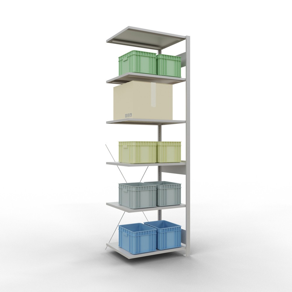 Fabricado con chapa de calidad, el estante se mantiene estable incluso muy cargado. La superficie con recubrimiento de polvo del bastidor es resistente y además tiene un aspecto agradable. Los tirantes diagonales posteriores refuerzan la estantería y permiten un uso unilateral muy cómodo.