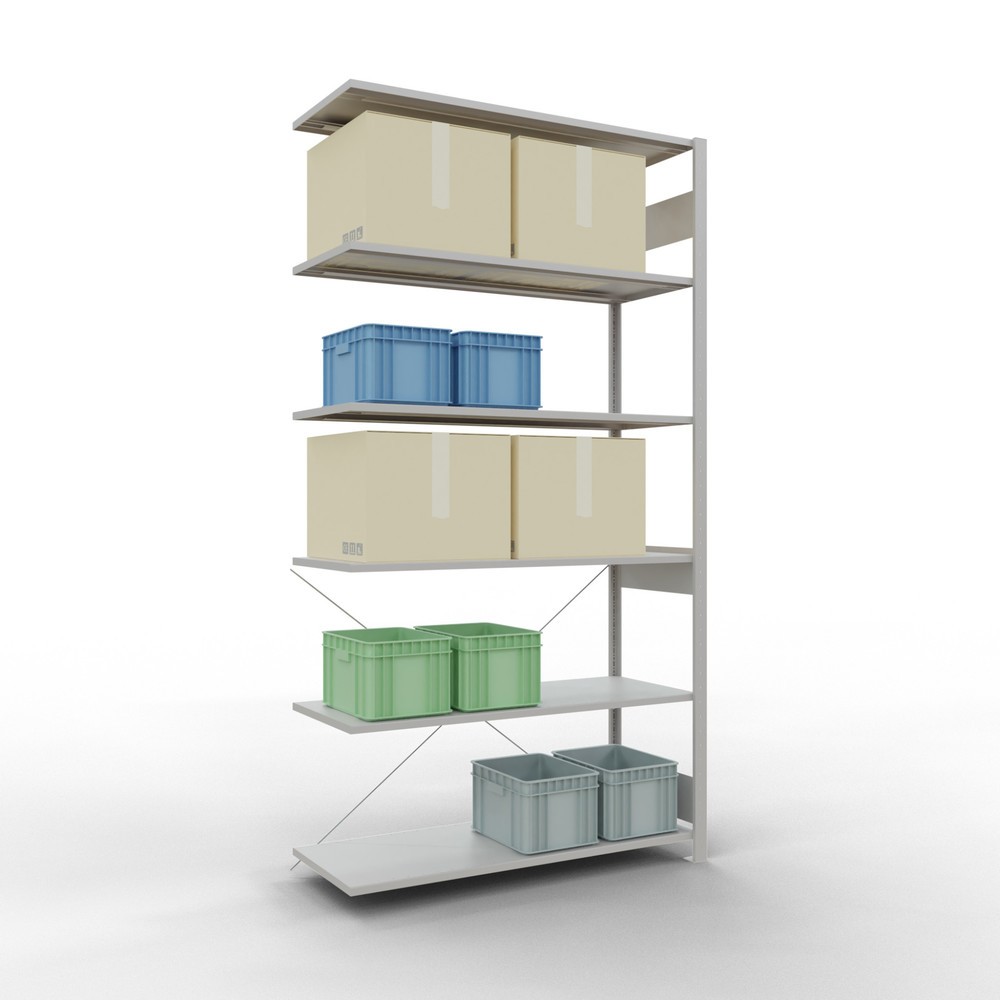 Fabricado con chapa de calidad, el estante se mantiene estable incluso muy cargado. La superficie con recubrimiento de polvo del bastidor es resistente y además tiene un aspecto agradable. Los tirantes diagonales posteriores refuerzan la estantería y permiten un uso unilateral muy cómodo.